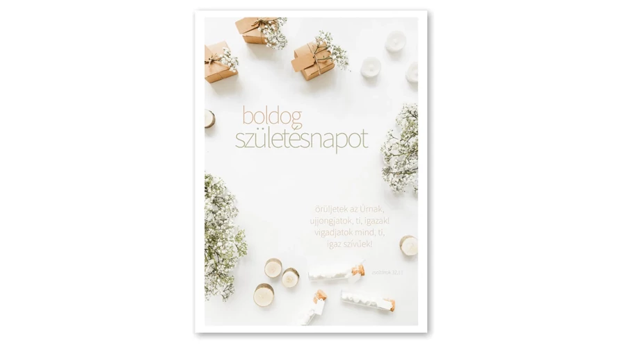 Borítékos képeslap - Születésnapra (méret: 13 x 18cm) Az ige az első oldalon: "Örüljetek az Úrnak, ujjongjatok, ti, igazak! Vigadjatok mind, ti, igaz szívűek! - Zsolt 32.11 Belső oldalon: "Áldjon meg téged az Úr, és őrizzen meg téged! Ragyogtassa rád orcáját az Úr, és könyörüljön rajtad!" - 4Móz 6.24