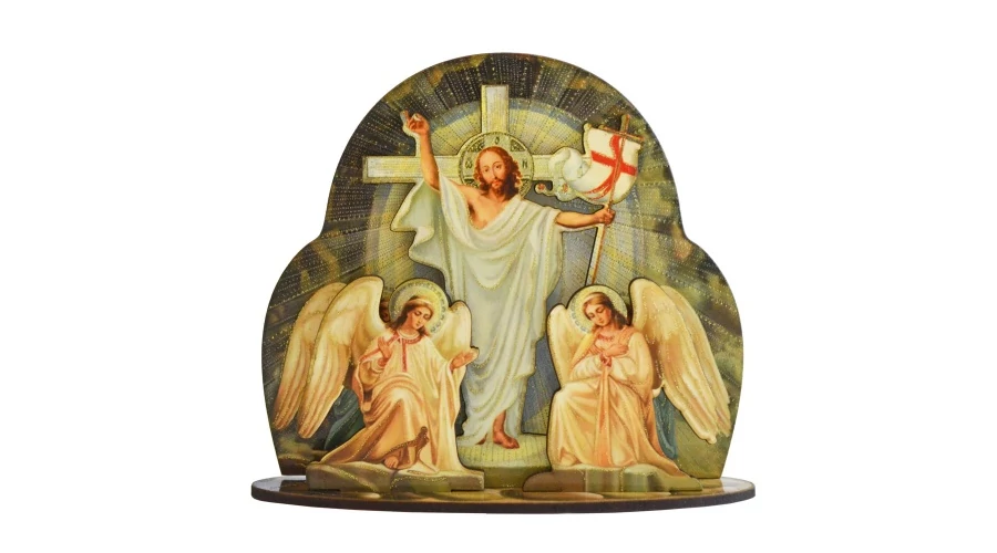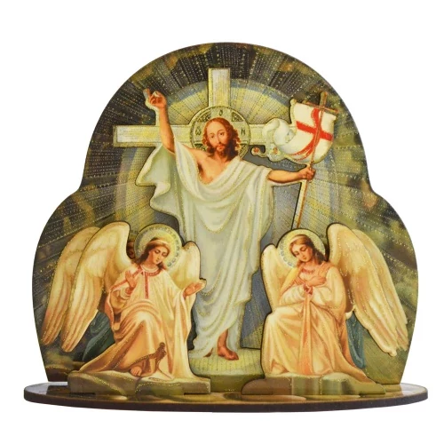 Isten Fia egy zászlót tart a kezében, amely a bűn és az ellenség feletti győzelmet, valamint a Mindenható dicsőségét jelképezi. Jézus Krisztus két oldalán angyalok térdelnek, hódolatukat fejezve ki a világ Megváltója előtt.
