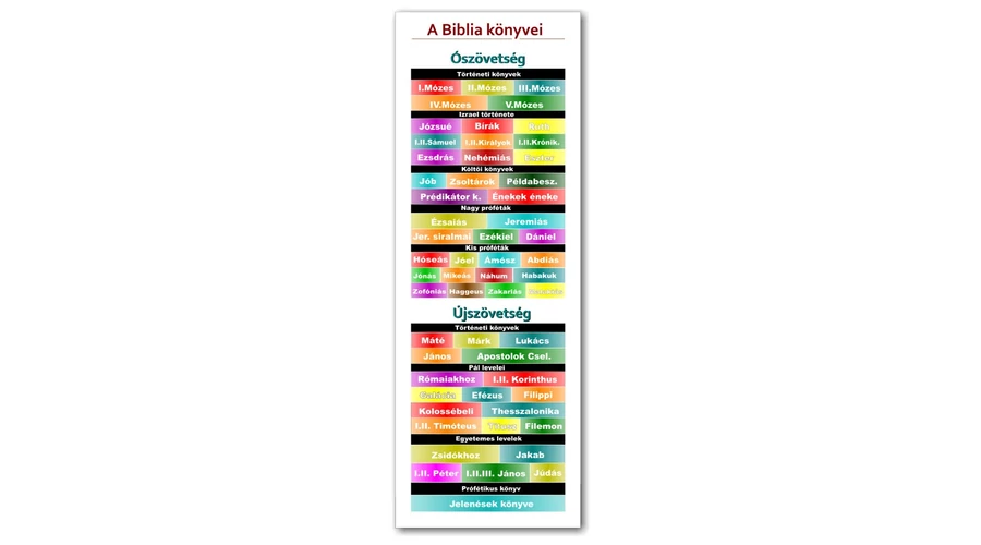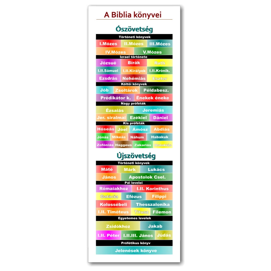 Téglalap alakú, fényes (laminált) karton, amelyen a Biblia könyvei olvashatók. (méret: 5 x 15cm) Ötletes ajándék bármely alkalomra. Bátorít és egyben segít. A köszönet, szeretet vagy a hála kifejezésére kiváló kedves kis figyelmesség. Remek ajándék gyermekeknek vagy keresztyéntáborok, iskolák egységes, ajándékcsomagok összeállításához.