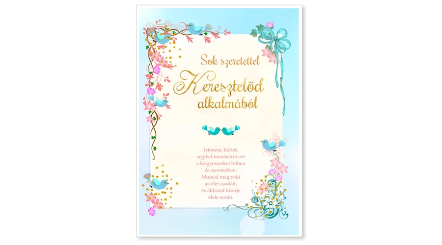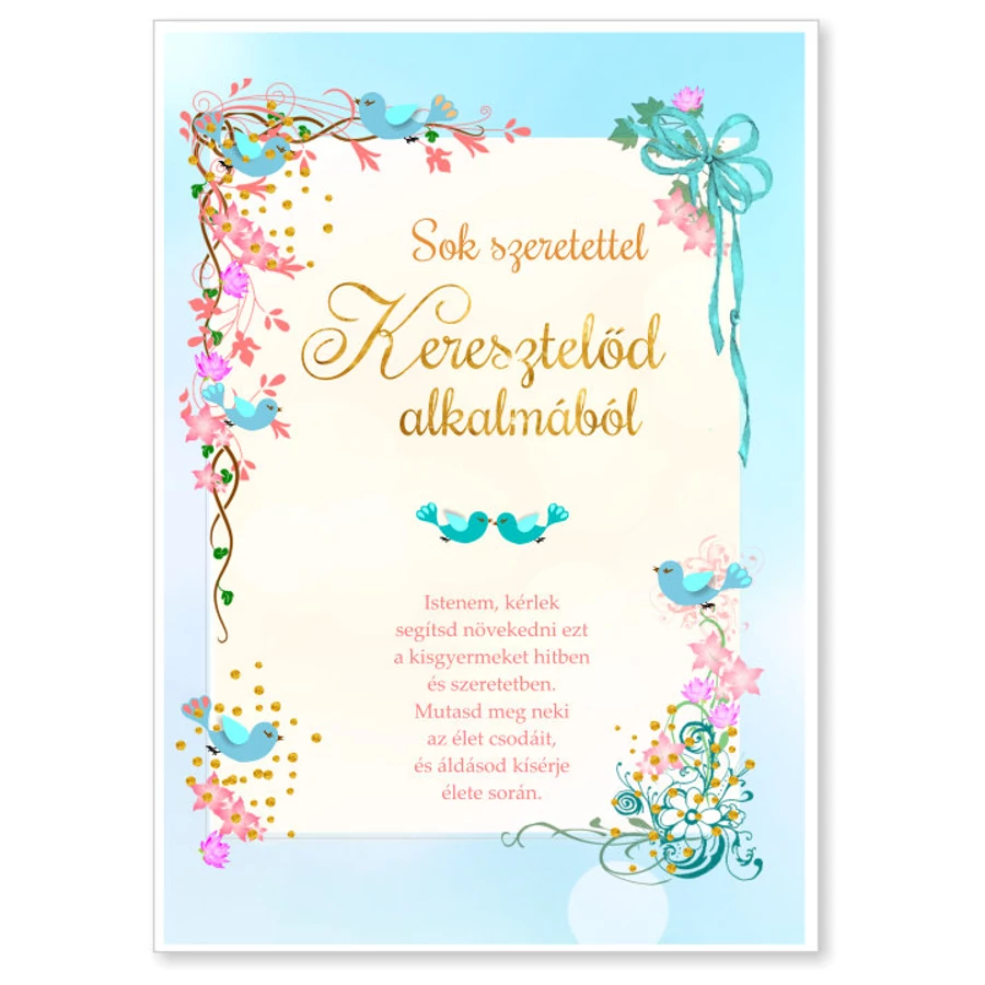 Borítékos képeslap - Keresztelőd alkalmából méret: 13 x 18cm Vers az első oldalon: "Istenem, kérlek segítsd növekedni ezt a kisgyermeket hitben és szeretetben. Mutasd meg neki az élet csodáit, és áldásod kísérje élete során."