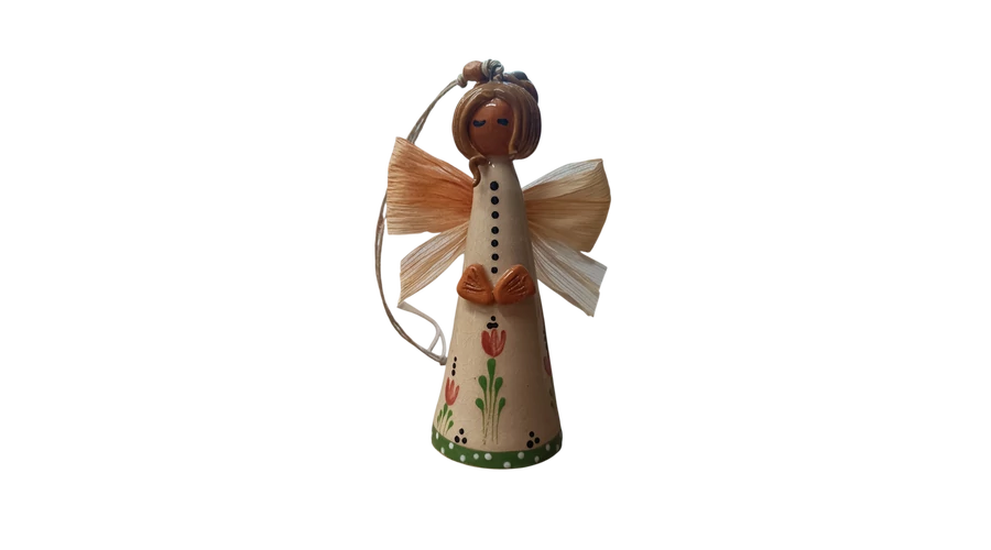 Egyedi kézzel készített kerámia angyal, kukoricacsuhé szárnyakkal. Mérete: Szélesség: 5cm; Magasság: 13cm