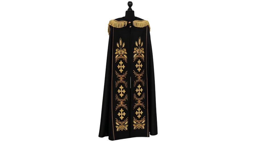 Paszományos fekete palást, hátán gazdag hímzéssel.