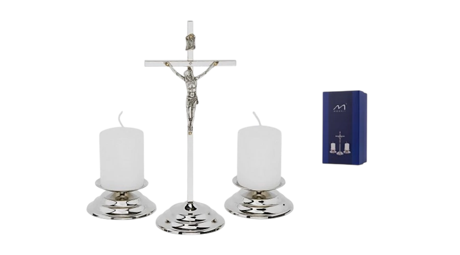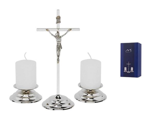 A készlet tartalma: állókereszt magassága 190 mm - 1 db. gyertyatartó, magasság 25 mm - 2 db. fehér gyertya, magasság 55 mm - 2 db. A készlet elegáns dobozban van csomagolva.